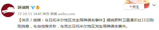 [快訊!俄媒:烏日托米爾地區(qū)發(fā)生導彈襲擊事件]據(jù)俄羅斯衛(wèi)星通訊社11日剛剛消息,烏當?shù)孛襟w稱,烏克蘭日托米爾地區(qū)發(fā)生導彈襲擊事件。